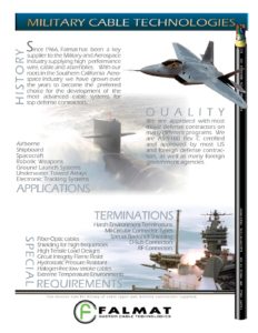 Falmat is a trusted supplier of custom cables to the defense industry, both domestic and International alliance forces for over four decades. Our knowledge of defense preferred materials, design, military specifications, and DOD test requirements for various cable applications, allow us to quickly design and meet your desired cable needs. We draw from our experience in many industries such as Aerospace, Subsea/Marine, Industrial, Robotic and Dynamic working cables, to solve ruggedized cable applications to meet defense applications.