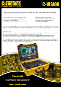 The C-Vision is a superbly engineered, dual functions video and communications systems for both inshore and offshore diving operations. The system allows both video and voice communication to be easily monitored and recorded in one easy to operate unit.