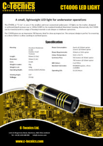 As standard the light’s housing is anodized aluminium and rated to 100m depth which makes it ideal for mounting on diver’s helmets. Alternatively the light is also available with a titanium housing to serve the ROV market.