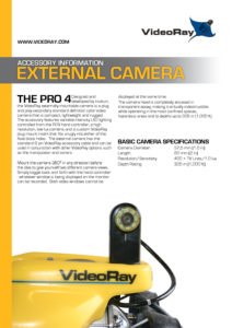 Designed and developed by Inuktun, the VideoRay externally mountable camera is a plug and play secondary standard definition color video camera that is compact, lightweight and rugged. The accessory features variable intensity LED lighting controlled from the ROV hand controller, a high resolution, low lux camera, and a custom VideoRay plug mount insert that fits snugly into either of the float block holes. The external camera has the standard 9 pin VideoRay accessory cable and can be used in conjunction with other VideoRay options such as the manipulator and sonars.