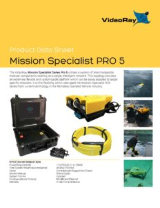 La configurazione del VideoRay Mission Specialist Series (MSS) Pro 5 è progettata per rendere il ROV veloce ed efficiente, con un peso di 10 kg (22 lb). Il sistema ha tre propulsori e ha una velocità di avanzamento di oltre 4,4 nodi e utilizza un sistema di componenti modulari intercambiabili che risiedono su un’unica rete intelligente.