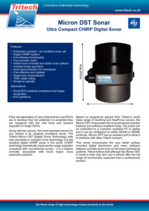 Il Tritech Micron DST Sonar (precedentemente noto come Seasprite – nome orginario per il Micron) è il più piccolo del sonar CHIRP digitale presenti sul mercato ed è ideale per l’utilizzo su tutte le configurazioni Videoray Pro 4. La tecnologia CHIRP (o Impulsi Radar Compressi ad altra intensità) è stata utilizzata per molti anni sopra l’acqua in molti sistemi RADAR commerciali e militari. La tecnologia CHIRP migliora notevolmente la risoluzione rispetto al sonar di scansione tradizionali ed è una caratteristica normalmente associata a sistemi più grandi e più costosi.